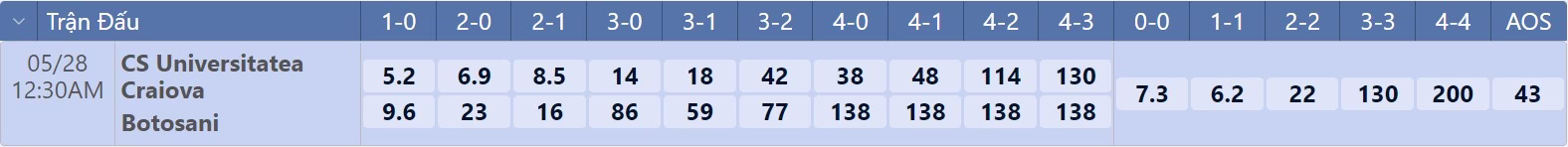 Công bằng mà nói Botosani sở hữu thành tích cũng như thực lực có phần khiêm tốn so với các cầu thủ Universitatea Craiova nhưng nhà cái lại không hoàn toàn đặt trọn niềm tin vào bên được đánh giá cao hơn khi chỉ đưa ra tỉ lệ bóng đá là 0.75. Nhưng nhìn vào thành tích mà Universitatea Craiova đang sở hữu thì đội bóng trở thành một lựa chọn đáng để thử với giới đầu tư. Trong quá khứ, hai bên có tỉ lệ thắng được đánh giá tương đương nhưng phần lớn các cuộc so tài đều kết thúc với rất nhiều pha lập công, trong trận đấu mới nhất vào tháng 12 năm ngoái, Universitatea Craiova và Botosani đã có cuộc đối đầu căng thẳng với sự xuất hiện của 4 bàn thắng. Kịch bản này cũng hoàn toàn có thể lặp lại khi cả hai đội đều đang sở hữu hiệu suất ghi bàn khá tốt trong thời gian qua.